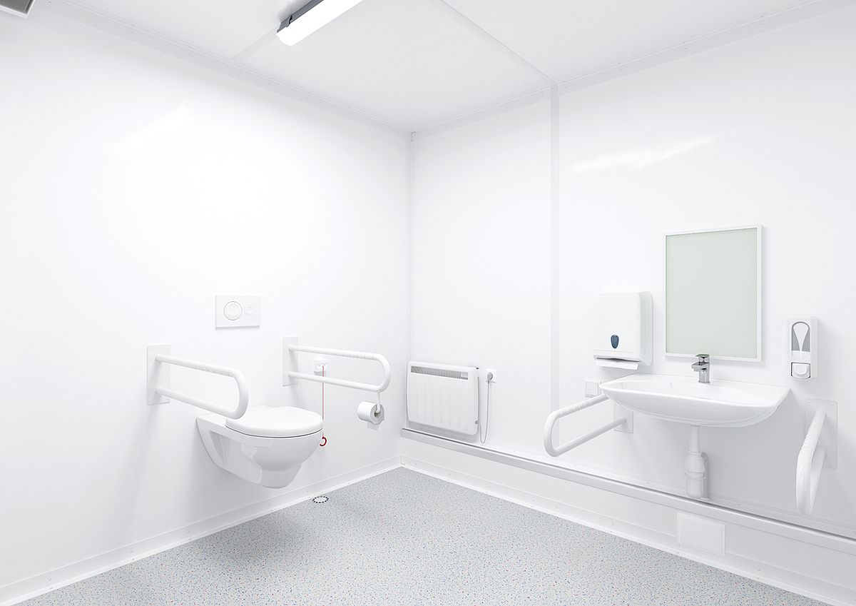Priority has been given throughout to creating a safe environment for users. Disabled sanitary containers include thoughtful features which cater to the special needs of their user group. Besides a number of flexible grip bars, these containers include an emergency call button, a retractable wash basin, and a large mirror. The container has a modern, aesthetic design and provides plenty of space for maneuvering.